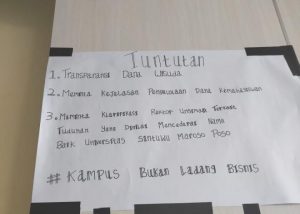 Mahasiswa dalam orasinya menuntut trasparansi dana wisuda dan meminta kejelasan pengelolaan dana kemahasiswaan.