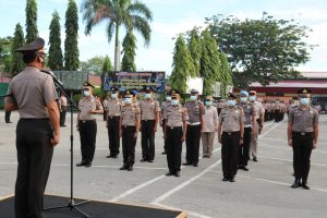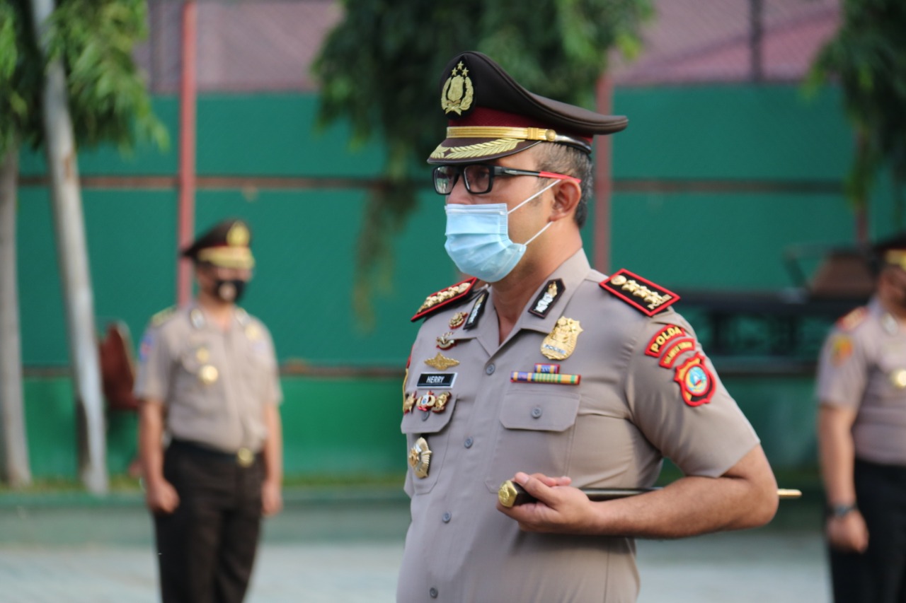 Di depan Aula Torabelo Polda Sulawesi Tengah Kapolda Irjen Pol. Drs. Syafril Nursal, SH,MH bertindak selaku Inspektur upacara Korp raport kenaikan pangkat personil Polda Sulteng, Rabu (1/7/2020).