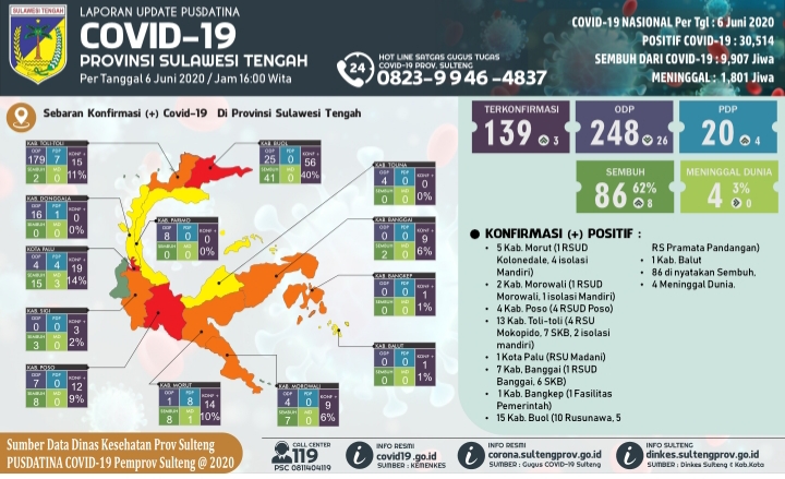 PALU,Nuansapos.Com – Info resmi dari Juru bicara Pusdantina Pemprov Sulteng, Haris Kariming. Angka Covid-19 Sulawesi Tengah perhari ini Sabtu, 6 Juni 2020 berjumlah 139 orang.
