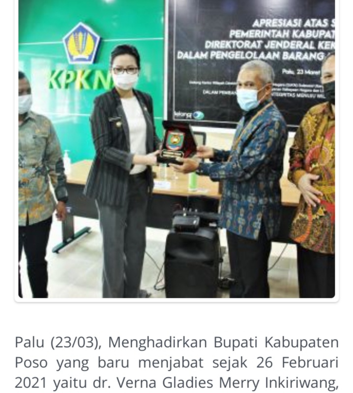 PALU, Nuansapos.com – Pasca dilantik sebagai Bupati Kabupaten Poso, pada 26 Februari 2021, Kantor Pelayanan Kekayaan Negara dan Lelang (KPKNL) Palu, menghadirkan dr. Verna Gladies Merry Inkiriwang, yang turut didampingi
