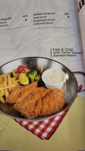 Saya memesan beberapa menu termasuk makanan penutupnya berupa pisgor.dan teman saya memesan beberapa makanan dan minuman.ketika makan di hidangkan oleh pelayan yg bernama Sri,kami pun menyantapnya,saya yang menyantap pesanan menu fish & chip with tartar sauce merasa enak,Tapi ketika mencoba salah satu bagian dari hidangan ini ternyata sudah sangat basih dan kelihatan makanan bekas sudah beberapa hari di hidangkan lagi,teman saya pun mencobanya dan sama dia mengatakan ini makanan basi.