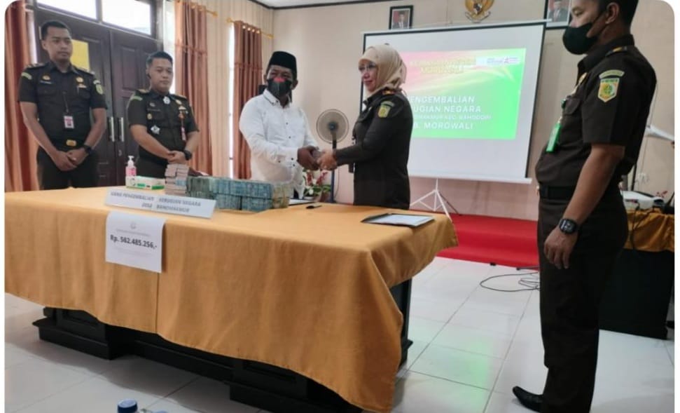 MOROWALI, Sulawesi Tengah- Kejaksaan Negeri (Kejari) Morowali berhasil mengembalikan uang kerugian negara sebesar Rp.562.435.256 dari mantan Kades Bahomakmur, Kecamatan Bahodopi, Kabupaten Morowali.