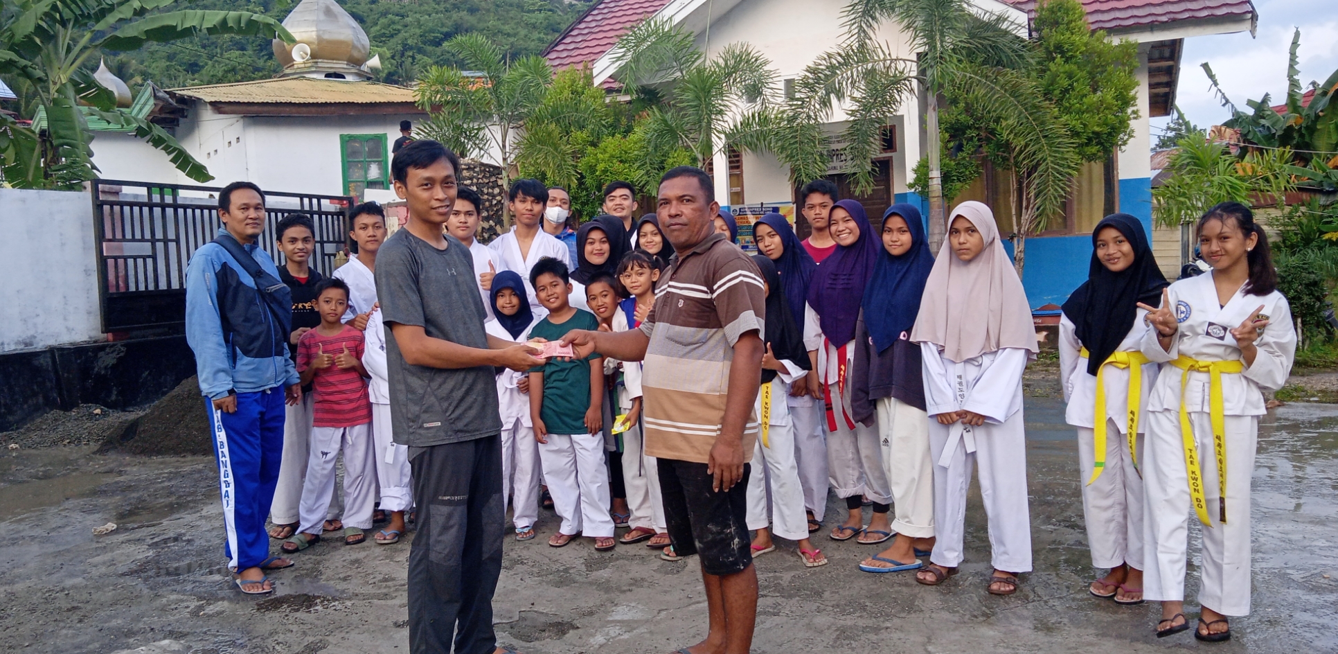 Penyerahan sumbangan berupa uang berlangsung di halaman SDN Inpres Soho yang diserahkan langsung oleh Pelatih Sabeum Teguh Prasetyo DAN I Kukkiwon, kepada Tahrim alias Aco selaku Bendahara Panitia Pembangunan Masjid Al-Karim sekaligus pengurus masjid, Kamis (16/12) sore.
