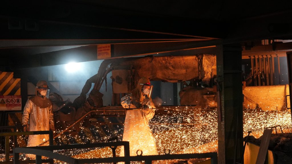 Karyawan dengan APD lengkap melakukan peleburan logam di smelter kawasan IMIP, Morowali. Hilirisasi teknologi tinggi ini bertujuan meningkatkan nilai tambah mineral mentah, menjadi motor utama pendorong pertumbuhan ekonomi Sulawesi Tengah hingga 8,47 persen pada tahun 2025.