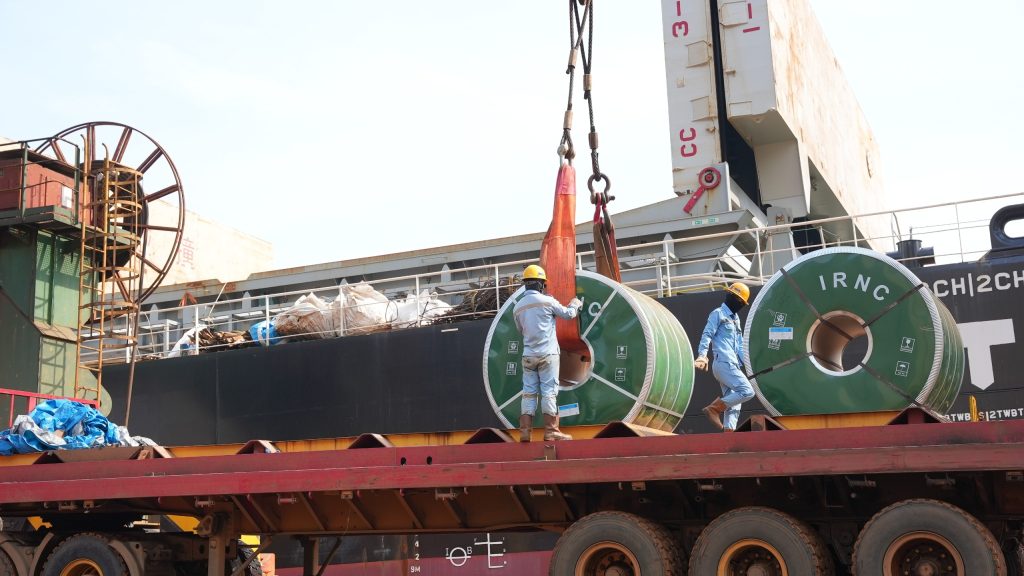 Petugas melakukan bongkar muat gulungan baja di pelabuhan kawasan IMIP, Morowali, untuk segera diekspor. Aktivitas pelabuhan ini mencerminkan dominasi ekspor Morowali mencapai 81 persen di Sulawesi Tengah, yang berdampak langsung pada surplus neraca perdagangan dan pendapatan devisa nasional.