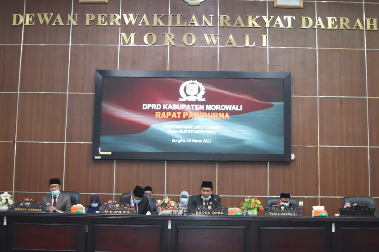 Rapat Paripurna yang digelar Dewan Perwakilan Rakyat Daerah (DPRD) Kabupaten Morowali dalam masa persidangan II, dengan agenda Penyampaian Laporan Keterangan Pertanggungjawaban (LKPJ) Tahun Anggaran 2020 Pemda Morowali, Selasa, (16/03).