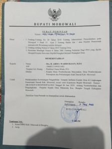 MOROWALI, Sulawesi Tengah- Kepala Dinas (Kadis) Pemberdayaan Masyarakat Desa Pemberdayaan Perempuan dan Perlindungan Anak (DPMDP3A) Kabupaten Morowali, Drs. H. Abdul Wahid Hasan, M. PD, melantik Pj. Kepala Desa Matansala, Amran Boli. Bertempat di Aula kantor PMDP3A, Kamis (09/06/2022).
