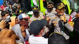 PARIMO, nuansapos.com – Masa aksi unjuk rasa yang berorasi di badan jalan Trans Sulawesi di depan Kantor Kecamatan Kasimbar Kabupaten Parigi Moutong (Sulteng), Senin (17/1/2022) pukul 08.00 Wita menyebabkan kemacetan kendaraan dari dua arah.