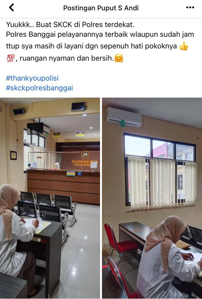 Salah satu postingan warga yang mengapresiasi pelayanan SKCK Polres Banggai di akun media sosial Facebook. (Foto: Humas Polres Banggai)