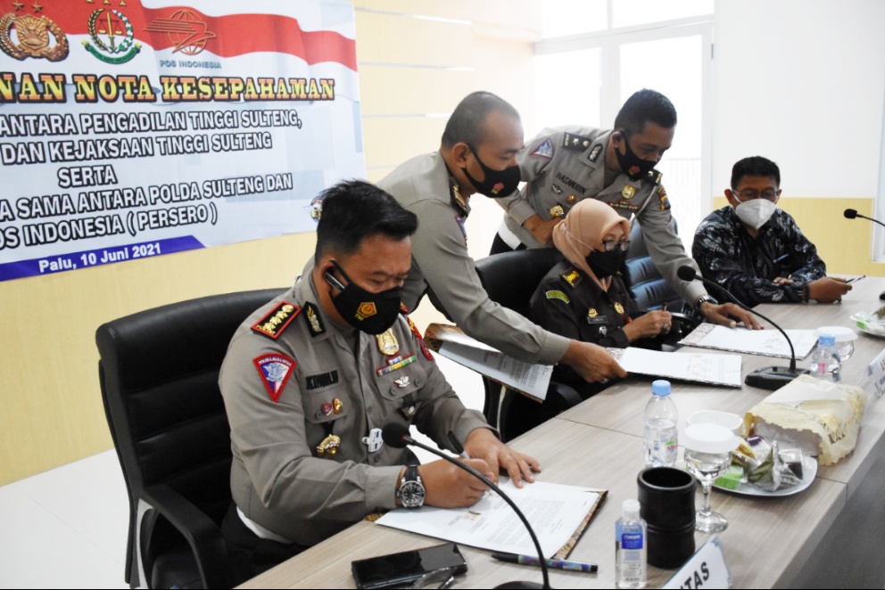 PALU, Nuansapos.com – Polda Sulteng menggelar penandatanganan nota kesepahaman bersama (MOU) dengan Pengadilan Tinggi Sulteng dan Kejaksaan Tinggi Sulteng serta Perjanjian Kerja Sama (PKS) antara Polda Sulteng dengan PT.Pos Indonesia bertempat di aula Ditlantas Polda Sulteng, Kamis (10/06/2021).
