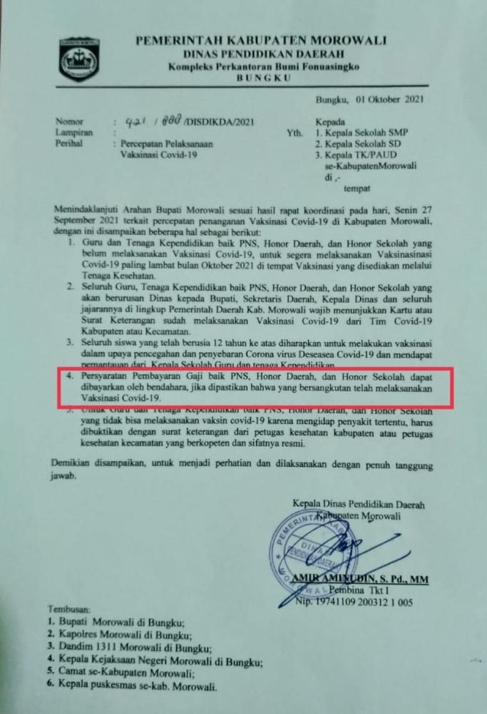 “Syarat vaksin sudah berlaku sejak tanggal dikeluarkan surat tersebut (1 Oktober 2021),” Tulis Kadis Pendidikan Morowali Amir Amirudin saat dikonfirmasi via WhatsApp (WA) oleh Wartawan media ini, Minggu [3/10/2021].