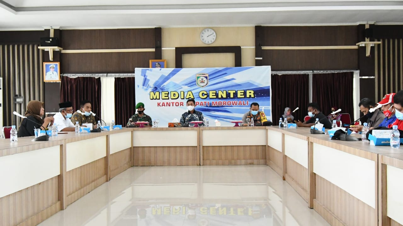 Bupati Morowali Drs.Taslim didampingi Dandim 1311/Morowali Letkol Inf Raden Yoga Raharja dan Kapolres Morowali AKBP Bayu Indra Wiguno, SIK, MIK serta Kadis Kominfo Bahtiar Pehoeya menggelar Konferensi Pers dengan Wartawan yang bertugas di Kab.Morowali.