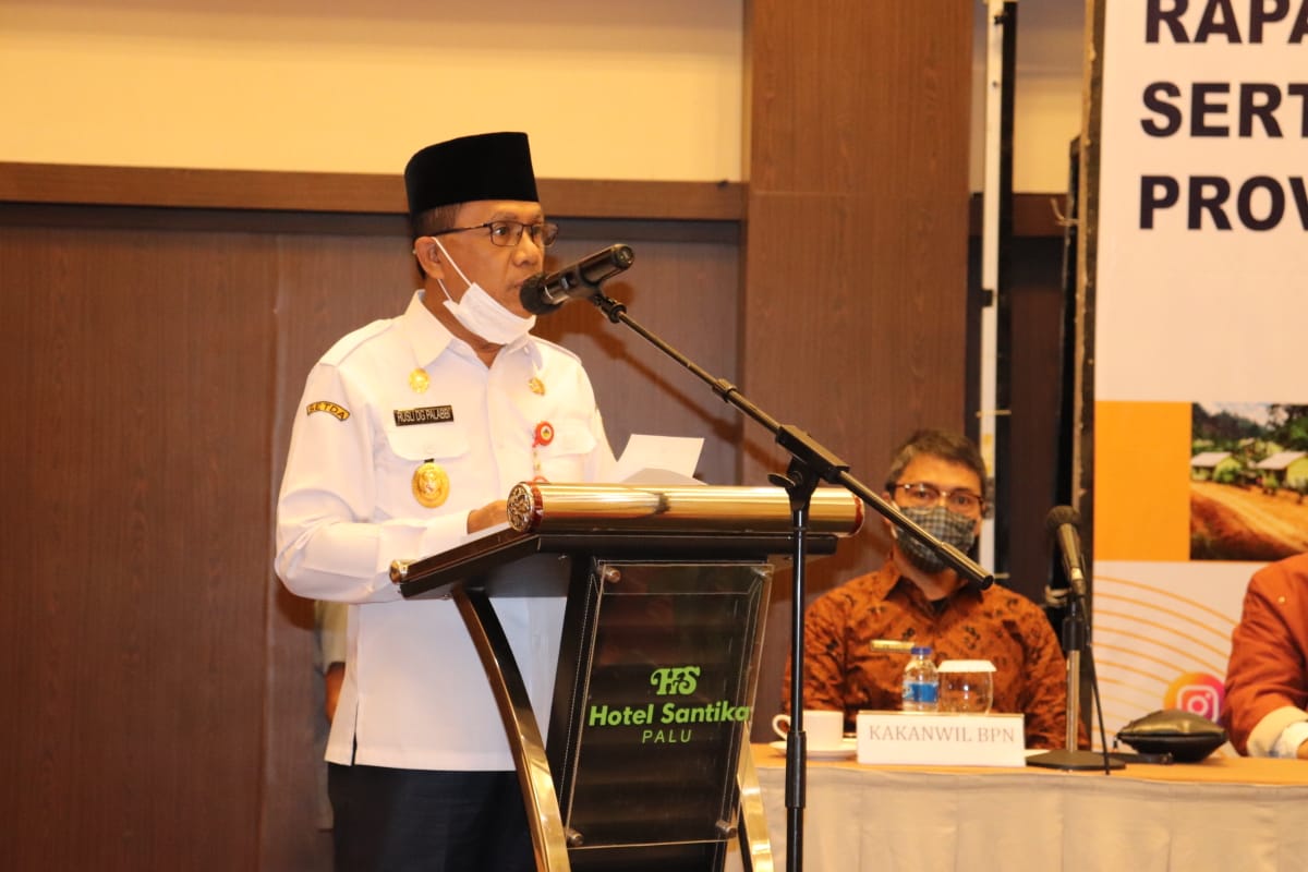 Wakil Gubernur Sulawesi Tengah, Dr. H. Rusli Dg Palabbi SH, MH secara resmi membuka Rapat Percepatan Penyelesaian Sertifikasi Tanah Transmisi di Sulawesi Tengah, bertempat di Aula Hotel Santika pada hari Rabu, 2 Desember 2020.